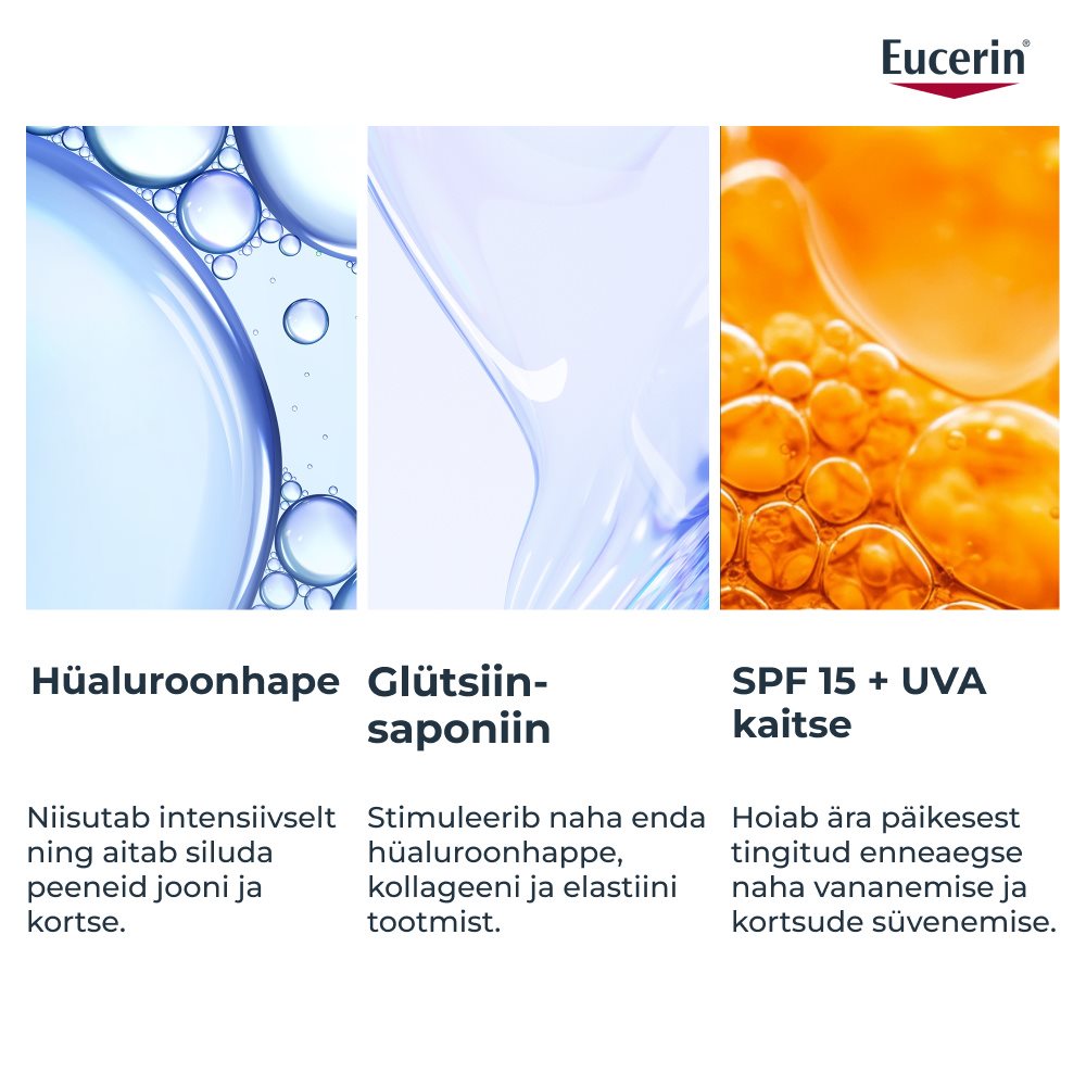 Kui nahk vananeb, väheneb selle loomulik hüaluroonhappe tase, mis põhjustab niiskuse kaotust, peeneid jooni ja sügavamaid kortse. Eucerin Hyaluron-Filler päevakreem SPF 15 on välja töötatud selleks, et võidelda vananemise märkidega, kasutades sihipärast segu kõrge ja madala molekulmassiga hüaluroonhappest, glütsiin-saponiinist ja enoksoloonist.