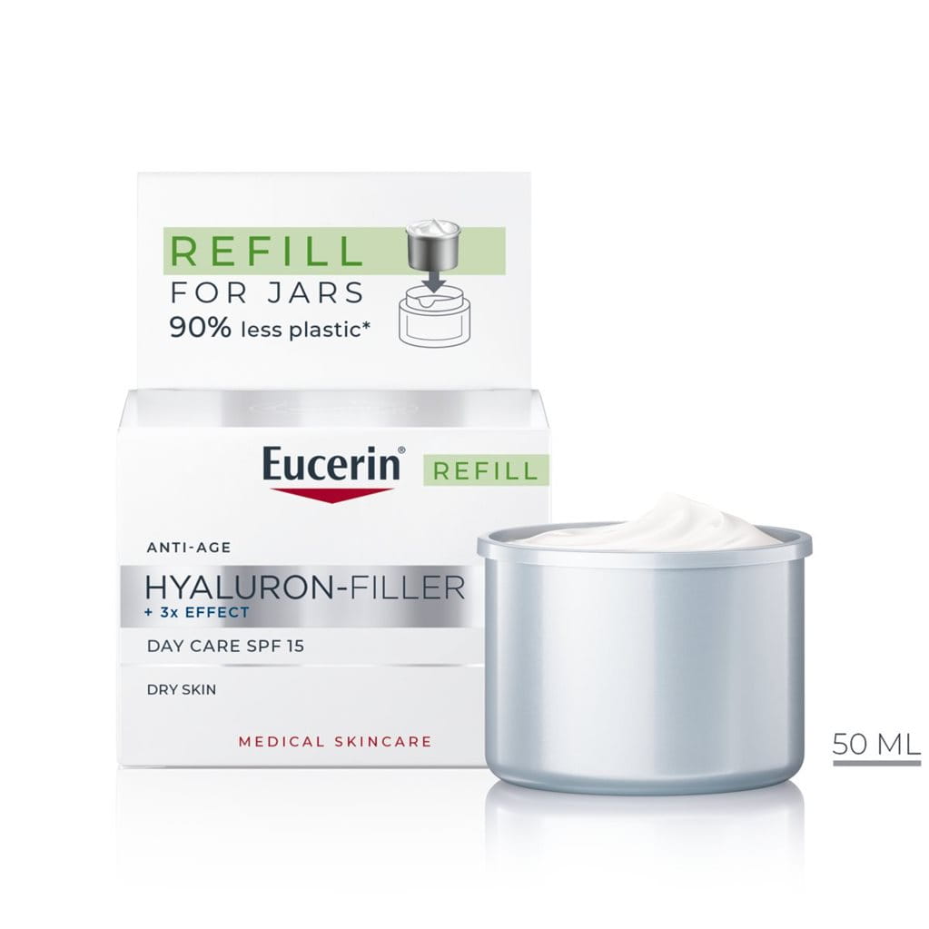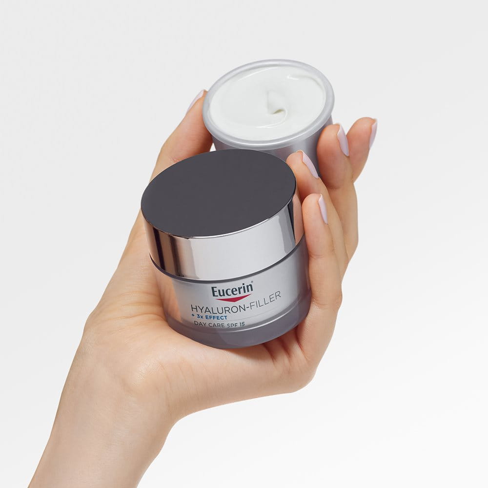 Igapäevane kokkupuude UV-kiirgusega kiirendab naha vananemist, mistõttu on SPF-kaitse hädavajalik – kuid mõned päikesekaitsekreemid võivad naha kuivaks muuta. Eucerin Hyaluron-Filler 3x Effect päevakreem SPF 15 kuivale nahale pakub laiaulatuslikku niisutust ja päikesekaitset ühes tootes, kaitstes fotovananemise eest ja lukustades niiskuse naha sisse, hoides selle päeva jooksul sileda, pinguloleva ja kaitstuna.