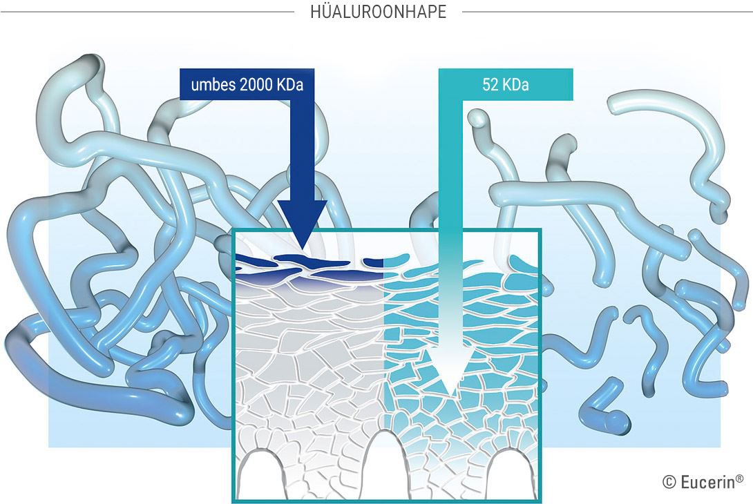 Eucerini unikaalne segu kõrg- ja madalmolekulaarsest hüaluroonhappest täidavad efektiivselt ka sügavaid kortse. Suure molekulmassiga hüaluroonhape parandab naha niisutatust ja silub selle välimisi kihte. Väikese molekulmassiga hülauroonhape, olles 40 korda väiksem1, imendub naha kihtidesse, sinna, kus tekivad sügavamad kortsud.