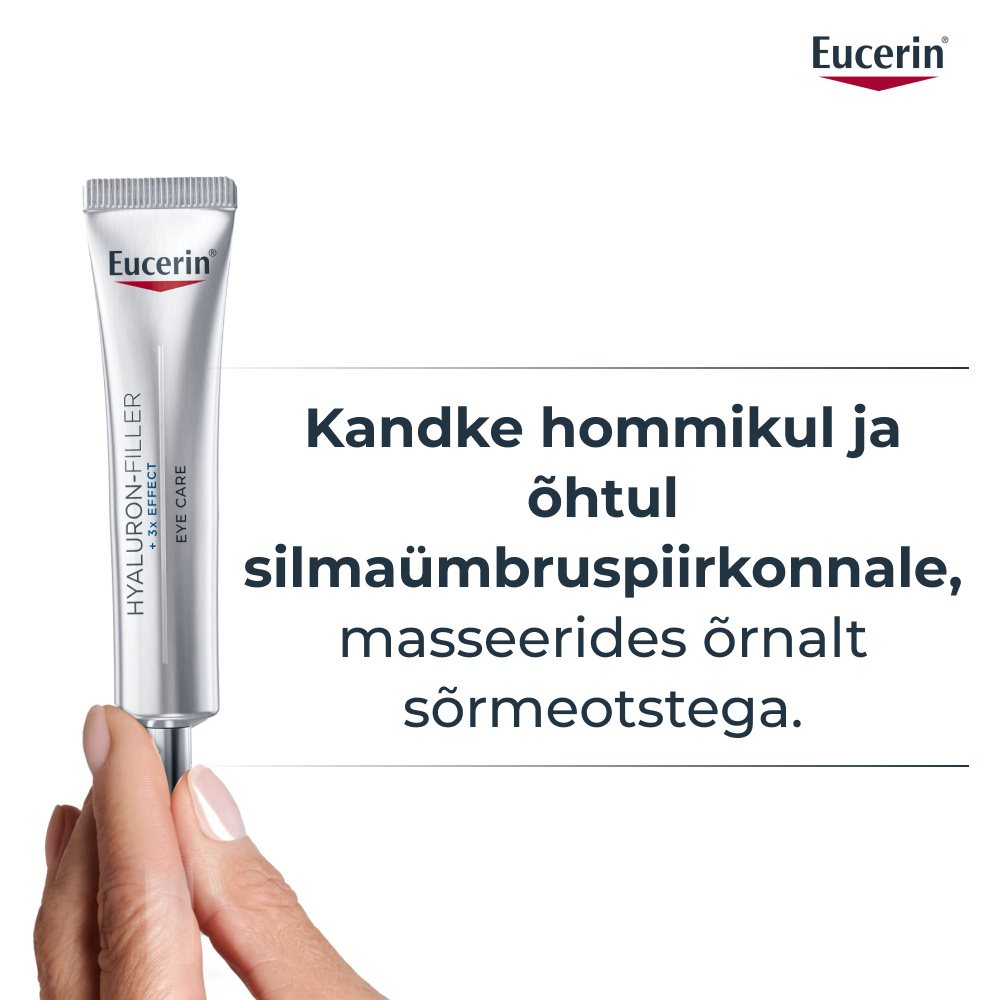 Eucerin Hyaluron-Filler +3x Effect silmaümbruskreem SPF 15 vähendab nähtavalt peeneid jooni ja kortse. Selle kolmekordse toimega koostis toimib kolmel viisil: täidab kortse kõrge ja madala molekulmassiga hüaluroonhappega, stimuleerib naha enda hüaluroonhappe tootmist glütsiin-saponiini abil ning aitab kaitsta enneaegse vananemise eest. Lõhnatu koostis imendub kiiresti ja on oftalmoloogiliselt testitud, muutes kreemi ideaalseks igapäevaseks kasutamiseks, isegi jumestuse all.